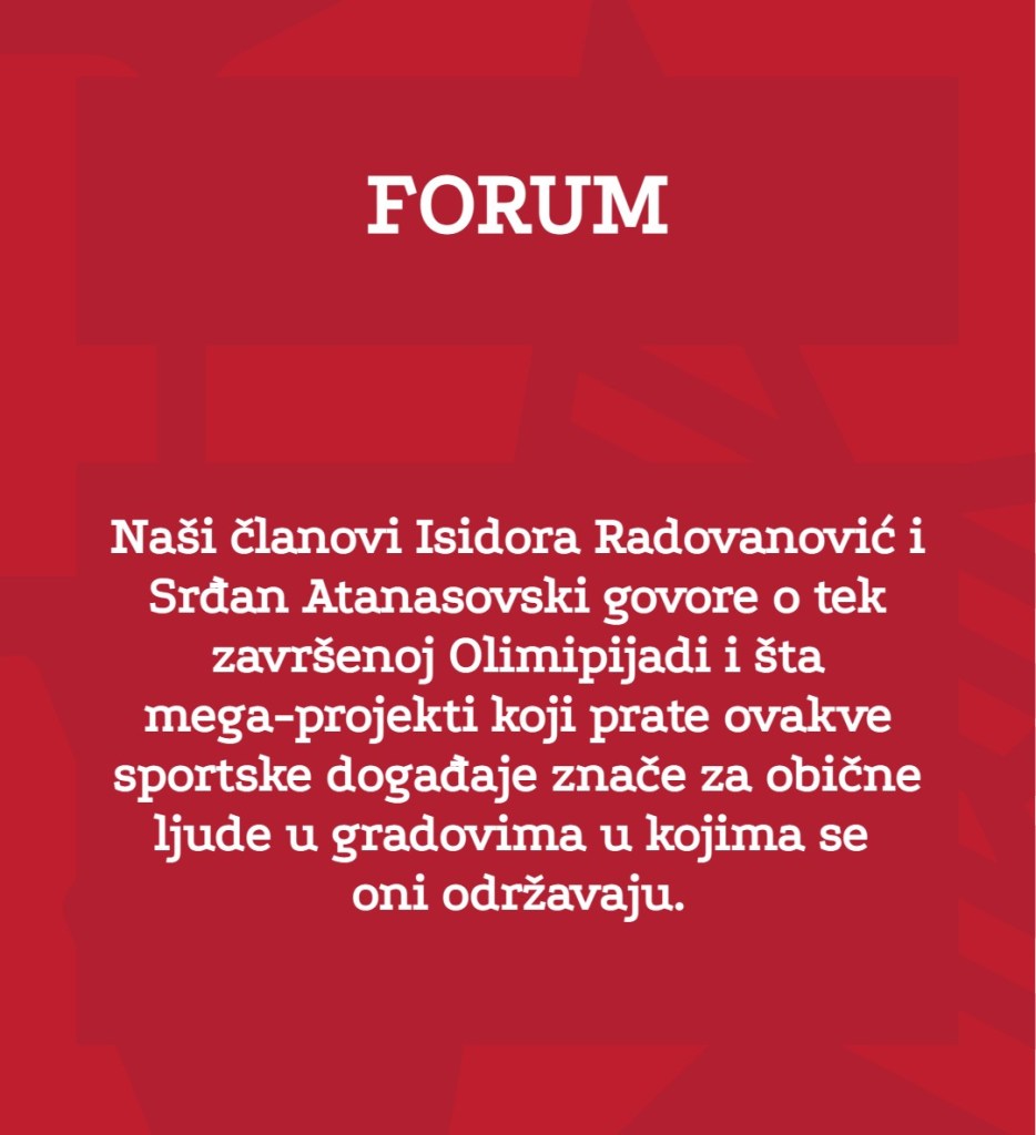 U rubrici Pogon, slušaćete intervju sa Jugoslavom Ristićem, predsednikom Saveza samostalnih sindikata Kragujevac, sa kojim smo razgovarali o posledicama agencijskog zapošljavanja, koje je dovelo do toga da su najnovija otpuštanja u Javnom komunalnom preduzeću Šumadija označena kao legalna. Sa Jugoslavom smo razgovarali i o pokušajima gušenja sindikalnog organizovanja i lošim uslovima rada u kragujevačkoj gradskoj upravi. U rubrici Ulica razgovoramo sa Trinom Binaku, članicom grupe Kolektiv za feminističku teoriju i akciju o aktuelnim feminističkim borbama koje ovaj kolektiv vodi u Prištini. Konačno, u rubrici Forum, naši članovi Isidora Radovanović i Srđan Atanasovski govore o tek završenoj Olimipijadi i šta mega-projekti koji prate ovakve sportske događaje znače za obične ljude u gradovima u kojima se oni održavaju.