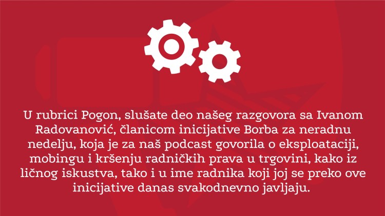 U rubrici Pogon, slušate deo našeg razgovora sa Ivanom Radovanović, članicom inicijative Borba za neradnu nedelju, koja je za naš podkast govorila o eksploataciji, mobingu i kršenju radničkih prava u trgovini, kako iz ličnog iskustva, tako i u ime radnika koji joj se preko ove inicijative danas svakodnevno javljaju. Sledi intervju sa Danilom Ćurčićem iz Inicijative za socijalna i ekonomska prava A11, sa kim smo razgovarali o novom zakonu o sezonskim i povremenim poslovima, protiv čijeg usvajanja se ova inicijativa trenutno bori, a koji bi doprineo dodatnom urušavanje radničkih prava tako što bi poslodavcima dozvolio da u mnogim sektorima, kao što je ugostiteljstvo, turizam, građevina i slično, radnike neograničeno drže u statusu povremeno zaposlenih. Konačno, u rubrici Forum razgovarali smo sa Ksenijom Kordić, članicom organizacije Femrevolt, o novim udarima na ekonomski položaj i prava majki u Hrvatstkoj.