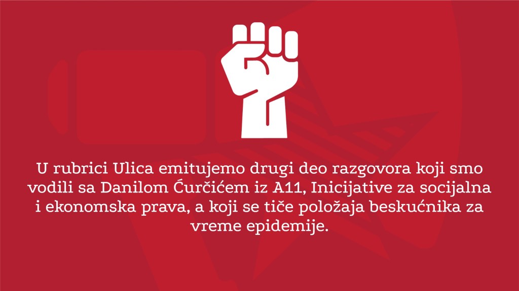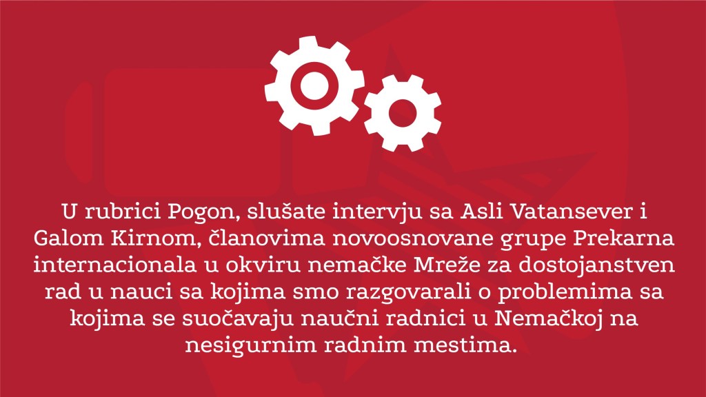 U rubrici Pogon, slušate intervju sa Asli Vatansever i Galom Kirnom, članovima novoosnovane grupe Prekarna internacionala u okviru nemačke Mreže za dostojanstven rad u nauci sa kojima smo razgovarali o problemima sa kojima se suočavaju naučni radnici u Nemačkoj na nesigurnim radnim mestima. U rubrici Ulica emitujemo drugi deo razgovora koji smo vodili sa Danilom Ćurčićem iz A11, Inicijative za socijalna i ekonomska prava, a koji se tiče položaja beskućnika za vreme epidemije. Konačno, u rubrici Forum slušate razgovor Aleksandre Vučković i Stefana Gužvice koji govore o konceptu prekarnog rada.