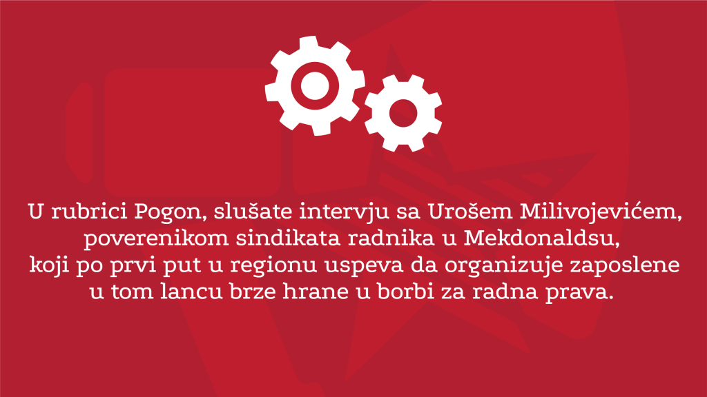 U rubrici Pogon, slušate intervju sa Urošem Milivojevićem, poverenikom sindikata radnika u Mekdonaldsu, koji po prvi put u regionu uspeva da organizuje zaposlene u tom lancu brze hrane u borbi za radna prava. U nastavku rubrike, emitujemo prilog o situaciji sa vijetnamskim radnicima u fabrici Linglong u Zrenjaninu, za koje se sumnja da su žrtve trgovine ljudima u cilju radne eksploatacije. U rubrici Ulica slušate prilog o ustavnoj inicijativi koju je pokrenula Združena akcija Krov nad glavom, kako bi zaštitila pravo na jedini dom i sprečila kriminalizaciju solidarnosti. Konačno, u rubirici Forum slušate delove diskusije Radničkog glasa o trenutnoj situaciji u Poljskoj i ograničavanju prava na abortus.