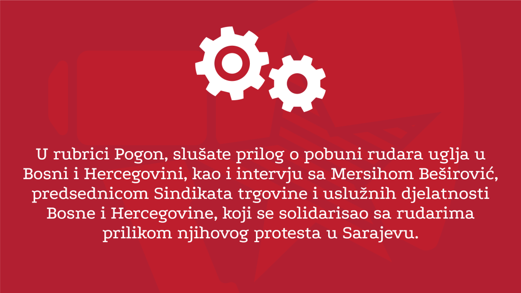 U rubrici Pogon, slušate prilog o pobuni rudara uglja u Bosni i Hercegovini, kao i intervju sa Mersihom Beširović, predsednicom Sindikata trgovine i uslužnih djelatnosti Bosne i Hercegovine, koji se solidarisao sa rudarima prilikom njihovog protesta u Sarajevu. U nastavku rubrike, razgovaramo sa Petrom Petrićem, predsednikom Sindikata prosvetnih radnika u Bačkoj Palanci, koji je prošle nedelje održao štrajk upozorenja i protest u ovom gradu. Konačno, u rubirici Forum, slušate delove diskusije Radničkog glasa o odnosu levice prema ratovima devedesetih i ratnim zločinima.