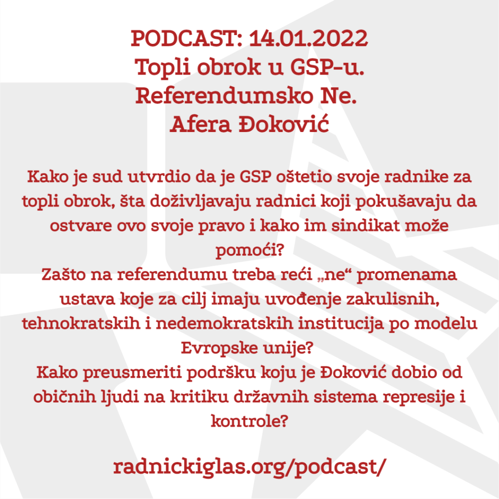 U rubrici Pogon slušate razgovor sa Ivanom Mihajlovićem iz Saveza ozbiljnih sindikalaca GSP-a o problemima radnika koji pokušavaju da ostvare svoje pravo na topli obrok u ovom preduzeću. U rubirici Forum slušate delove diskusije Radničkog glasa o tome zbog čega na predstojećem referendumu treba glasati protiv predloženih ustavnih promena. Konačno, u nastavku Foruma slušate razgovor o aferi Đoković.