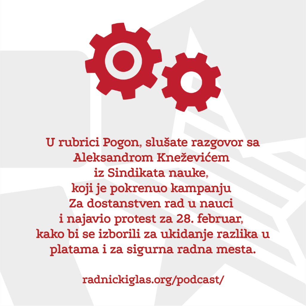 U rubrici Pogon, slušate razgovor sa Aleksandrom Kneževićem iz Sindikata nauke, koji je pokrenuo kampanju Za dostojanstven rad u nauci i najavio protest za 28. februar, kako bi se izborili za ukidanje razlika u platama i za sigurna radna mesta. U rubirici Ulica, razgovarali smo sa Milojkom Popovićem, predstavnikom radnika bivše fabrike Zastava kamioni u Kragujevcu koji najavljuju radikalizaciju protesta zbog neisplaćenih zarada od strane države u vrednosti od 160 miliona dinara. U rubrici Forum slušate delove diskusije Radničkog glasa o krizi u Ukrajini, odnosno o novom zveckanju oružja Putinovog režima i NATO pakta.
