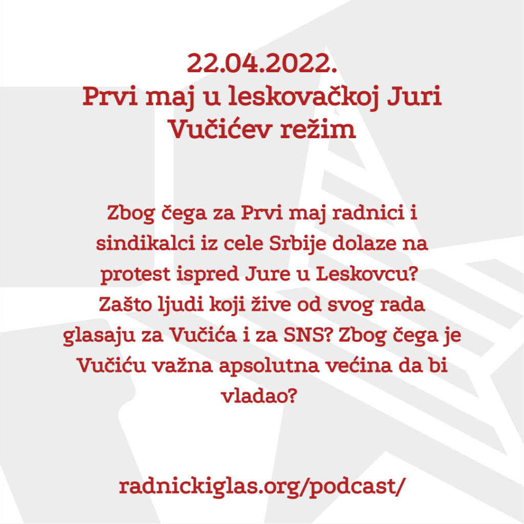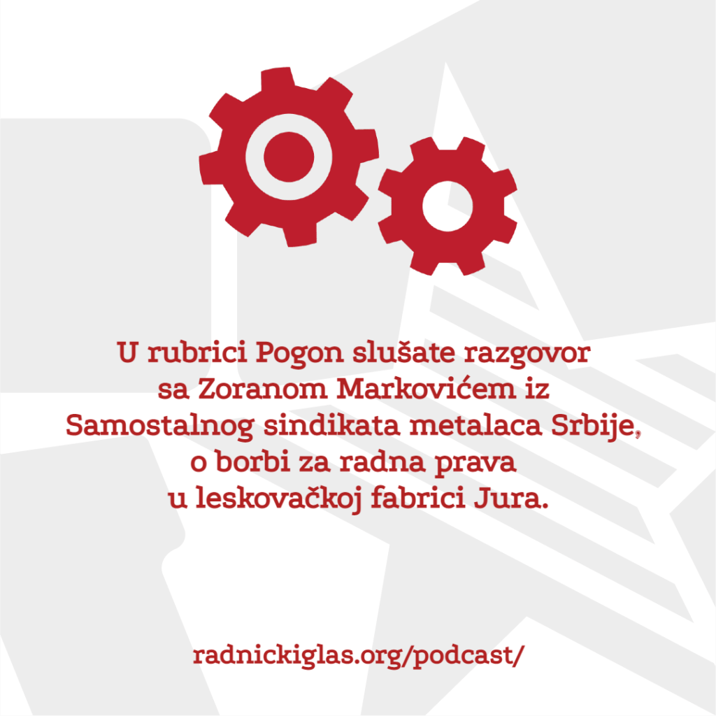U rubrici Pogon slušate razgovor sa Zoranom Markovićem iz Samostalnog sindikata metalaca Srbije, o borbi za radna prava u leskovačkoj fabrici Jura. U rubrici Forum slušate delove diskusije Radničkog glasa o Vučićevom režimu.
