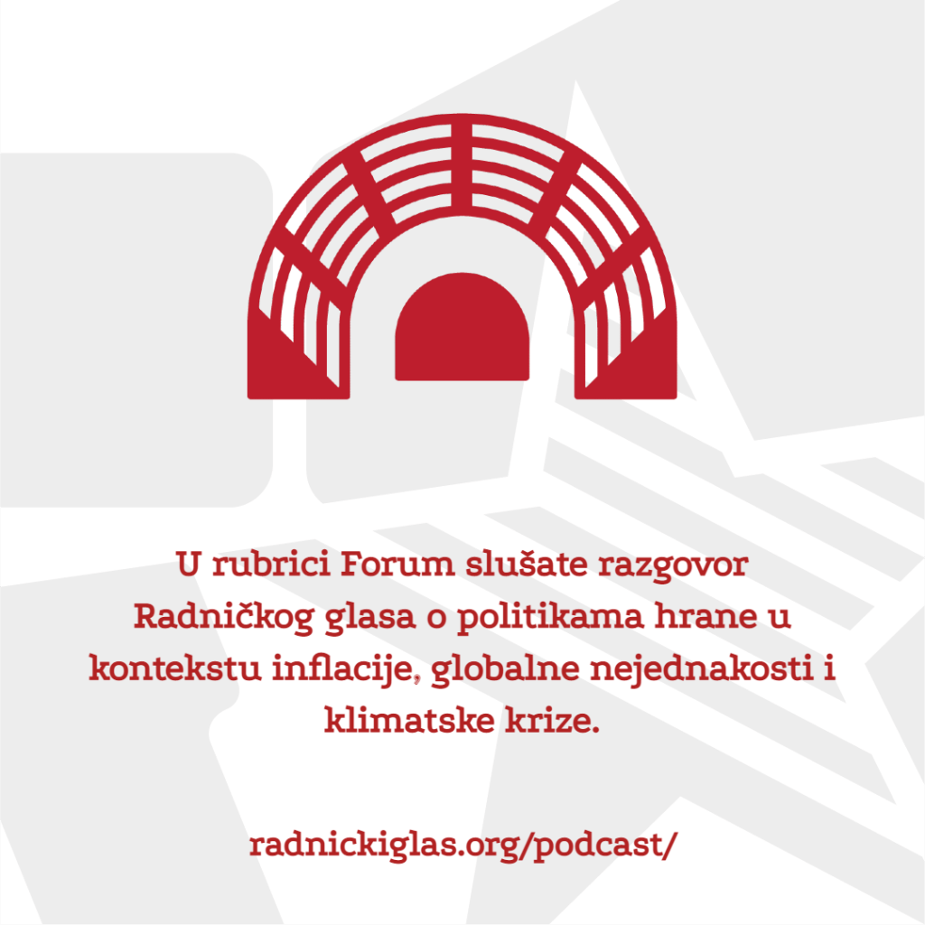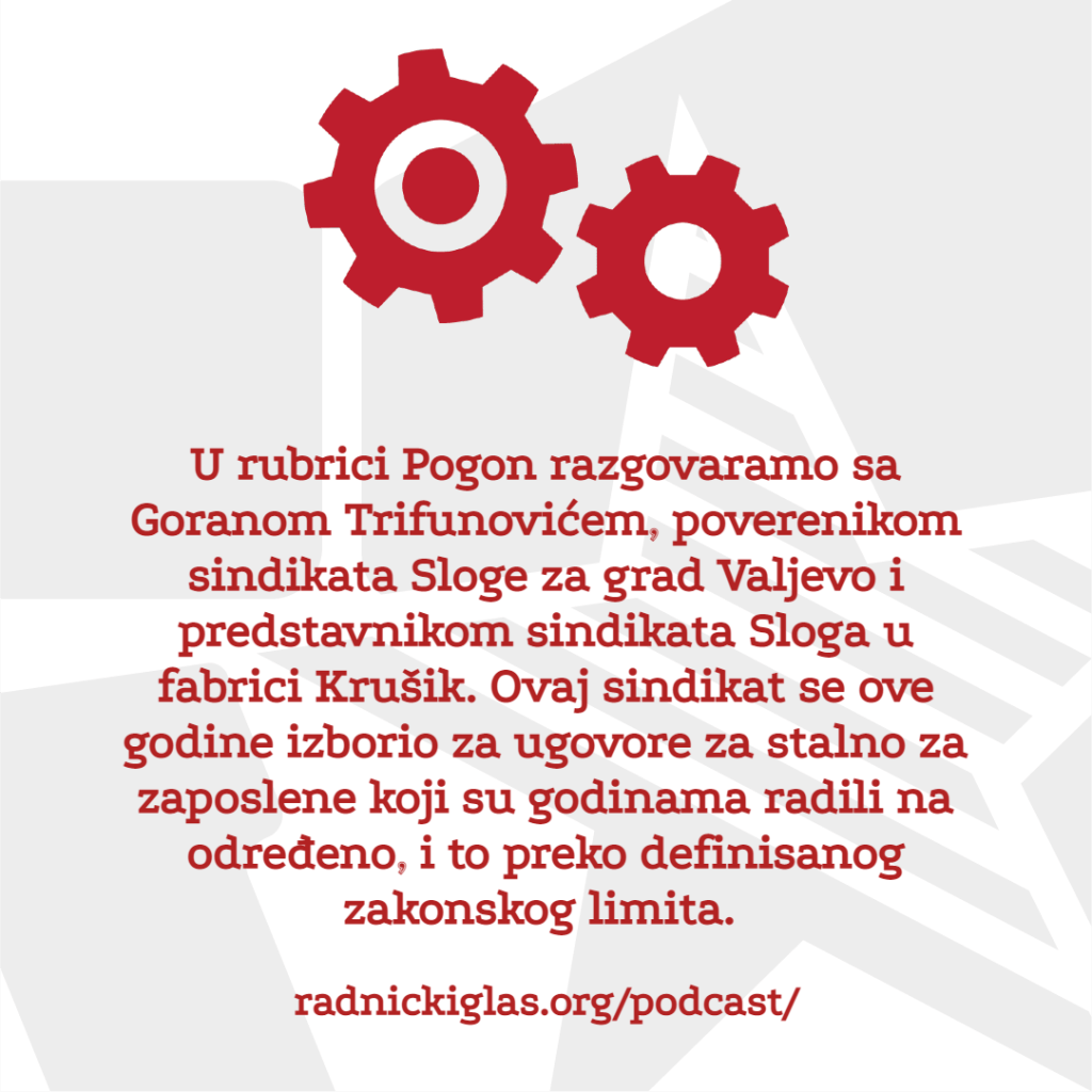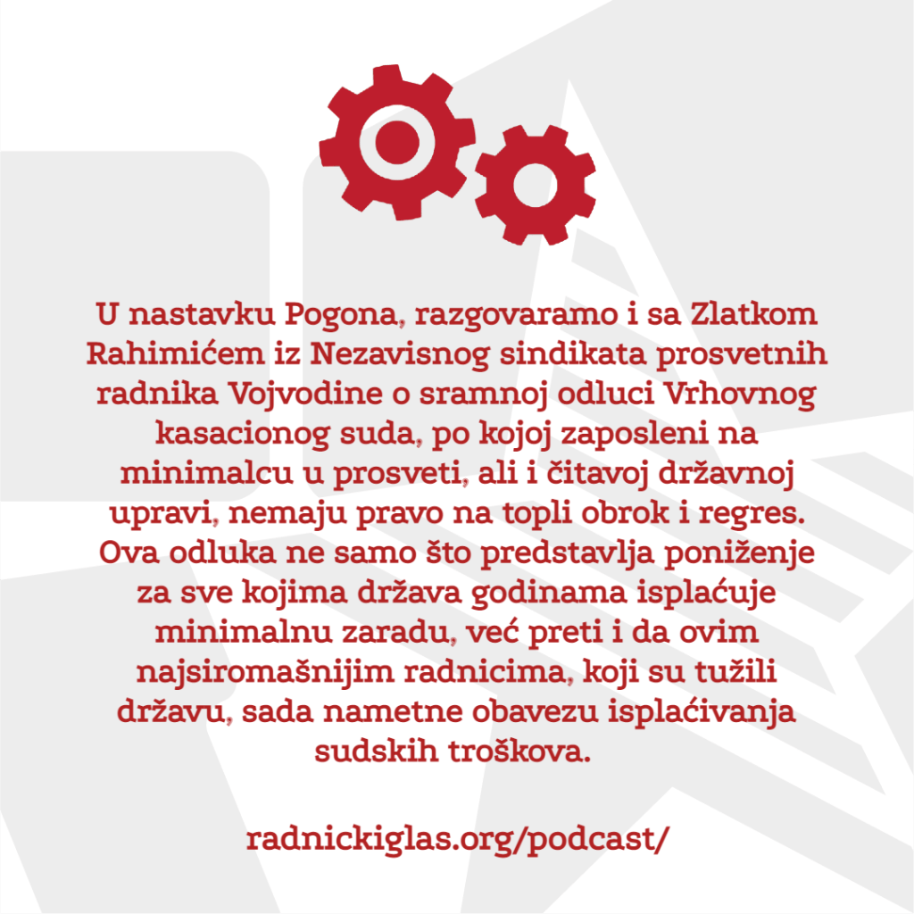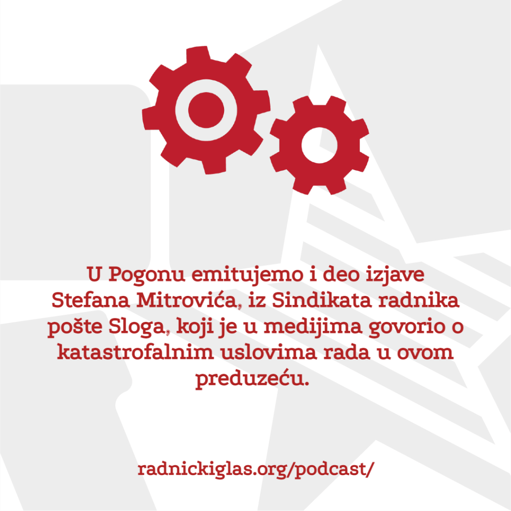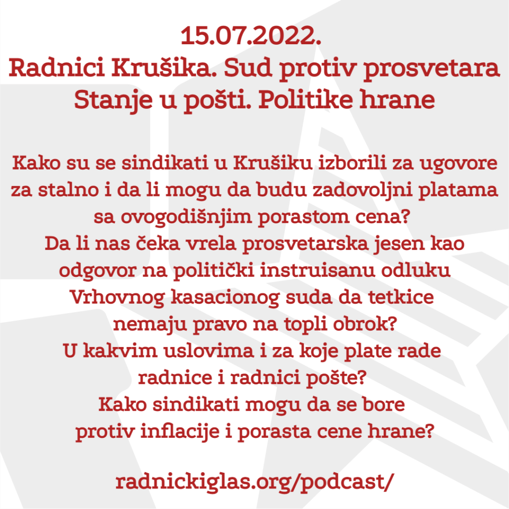 U rubrici Pogon razgovaramo sa Goranom Trifunovićem, poverenikom sindikata Sloge za grad Valjevo i predstavnikom sindikata Sloga u fabrici Krušik. Ovaj sindikat se ove godine izborio za ugovore za stalno za zaposlene koji su godinama radili na određeno, i to preko definisanog zakonskog limita. U nastavku Pogona, razgovaramo i sa Zlatkom Rahimićem iz Nezavisnog sindikata prosvetnih radnika Vojvodine o sramnoj odluci Vrhovnog kasacionog suda, po kojoj zaposleni na minimalcu u prosveti, ali i čitavoj državnoj upravi, nemaju pravo na topli obrok i regres. Ova odluka ne samo što predstavlja poniženje za sve kojima država godinama isplaćuje minimalnu zaradu, već preti i da ovim najsiromašnijim radnicima, koji su tužili državu, sada nametne obavezu isplaćivanja sudskih troškova. Emitujemo i deo izjave Stefana Mitrovića, iz Sindikata radnika pošte Sloga, koji je u medijima govorio o katastrofalnim uslovima rada u ovom preduzeću. Na kraju, u rubrici Forum, slušate razgovor Radničkog glasa o politikama hrane u kontekstu inflacije, globalne nejednakosti i klimatske krize.