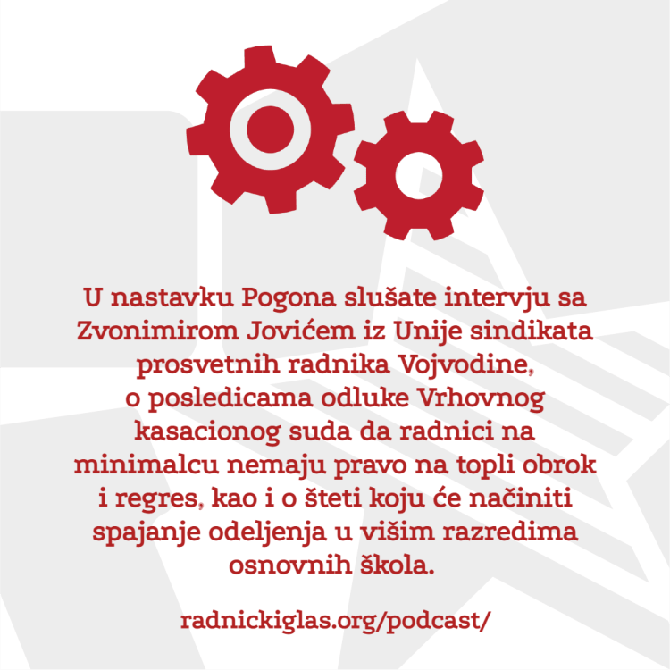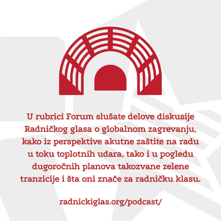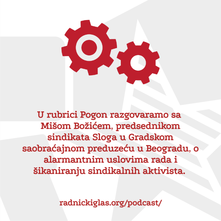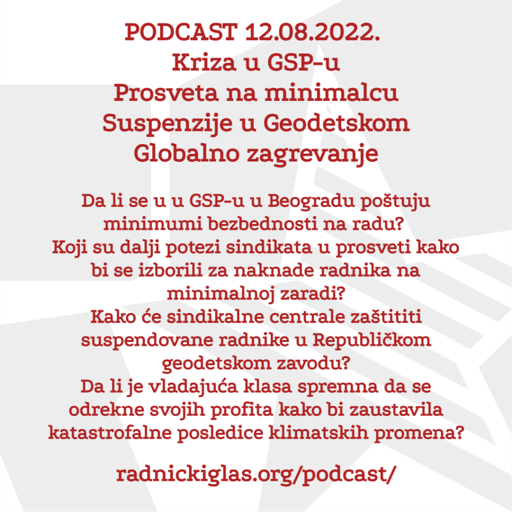U rubrici Pogon razgovaramo sa Mišom Božićem, predsednikom sindikata Sloga u Gradskom saobraćajnom preduzeću u Beogradu, o alarmantnim uslovima rada i šikaniranju sindikalnih aktivista. U nastavku Pogona, slušate intervju sa Zvonimirom Jovićem iz Unije sindikata prosvetnih radnika Vojvodine, o posledicama odluke Vrhovnog kasacionog suda da radnici na minimalcu nemaju pravo na topli obrok i regres, kao i o šteti koju će načiniti spajanje odeljenja u višim razredima osnovnih škola. Konačno, emitujemo i reakcije predstavnika sindikata Nezavisnost i Saveza samostalnih sindikata Srbije na najnovije suspenzije sindikalnih lidera u Republičkom geodetskom zavodu. U rubrici Forum slušate delove diskusije Radničkog glasa o globalnom zagrevanju, kako iz perspektive akutne zaštite na radu u toku toplotnih udara, tako i u pogledu dugoročnih planova takozvane zelene tranzicije i šta oni znače za radničku klasu.