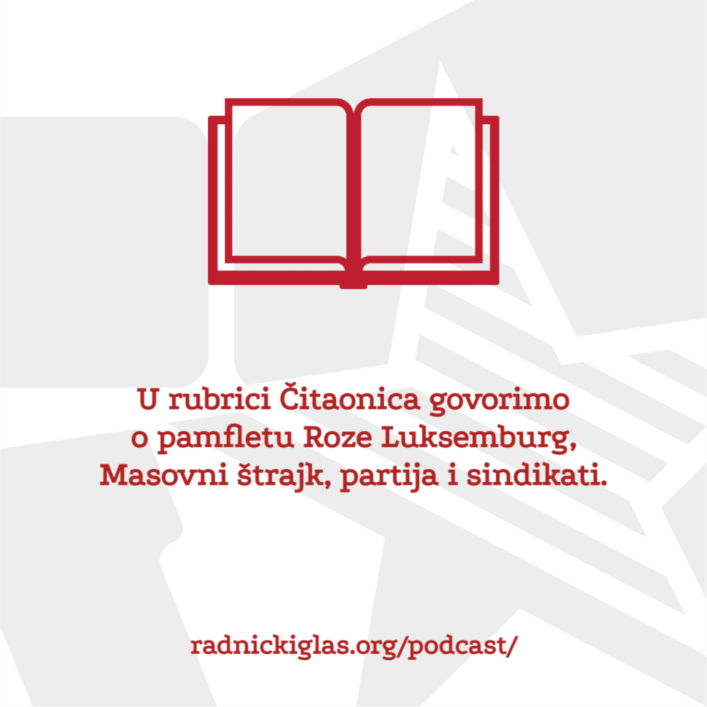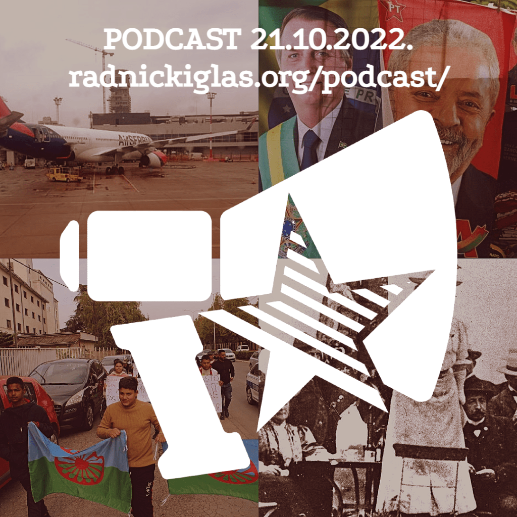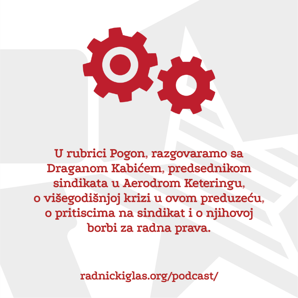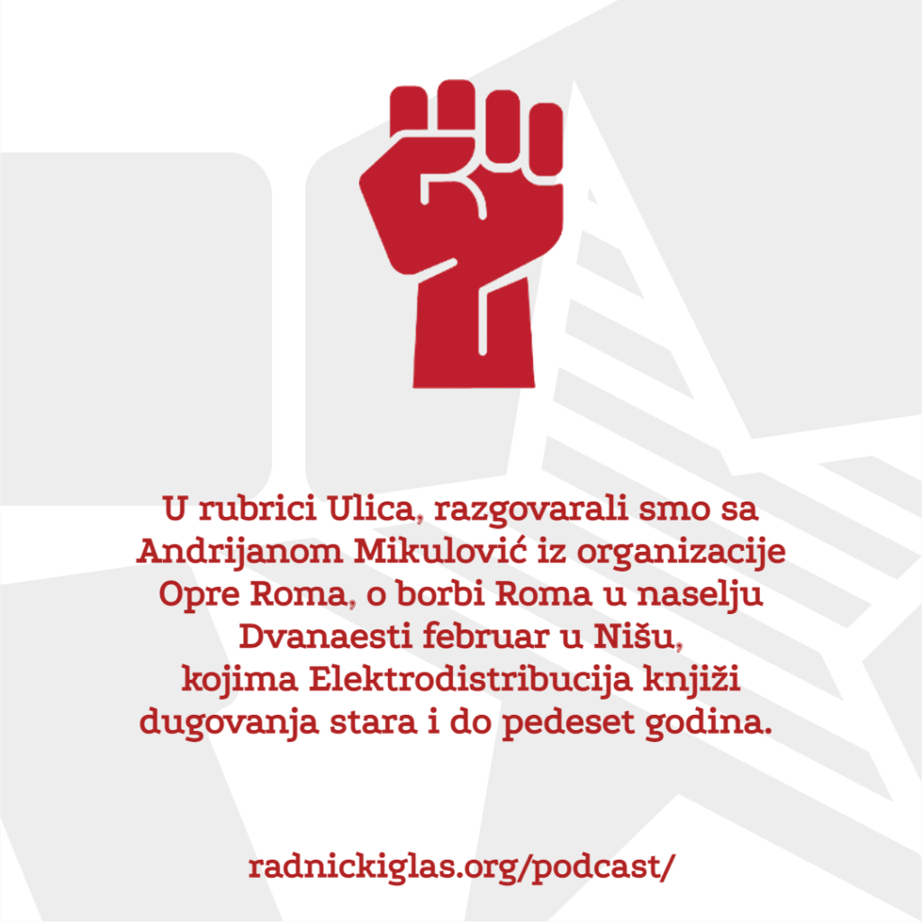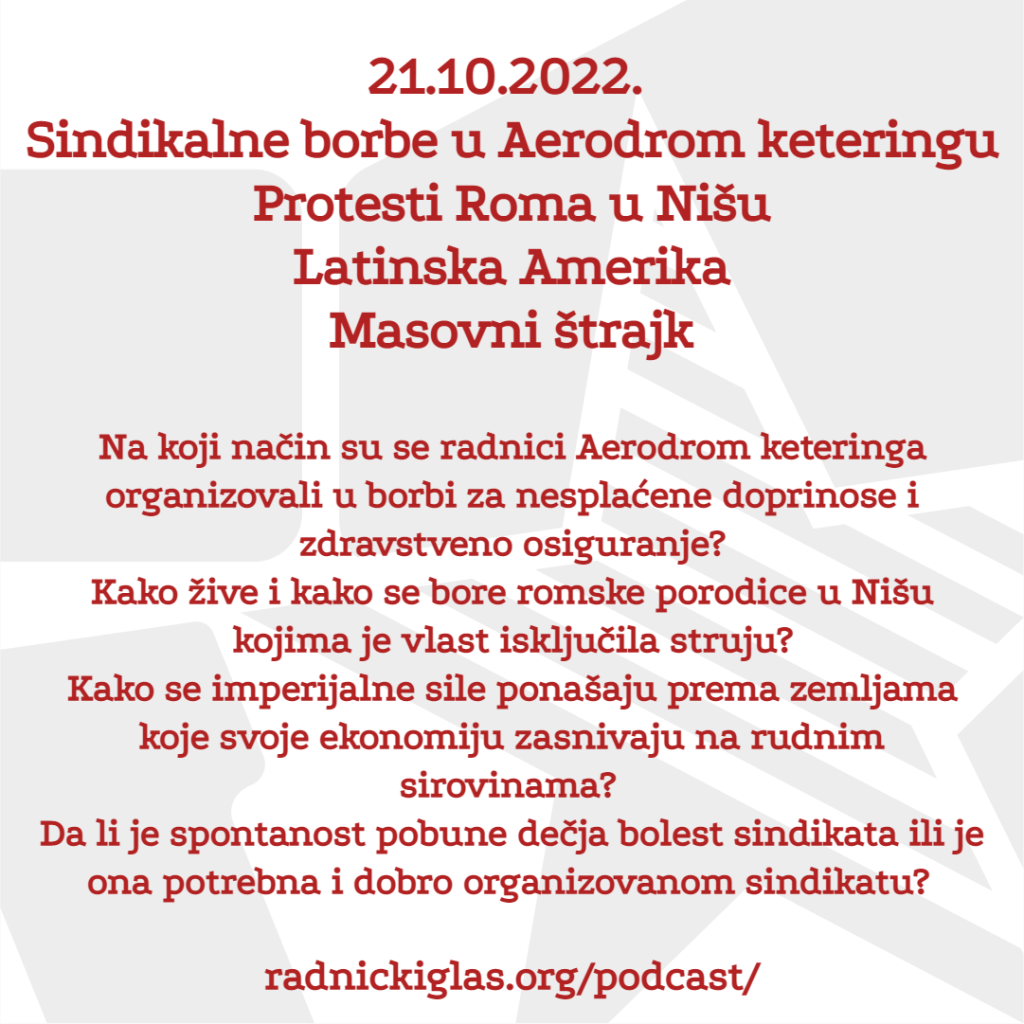 U rubrici Pogon razgovaramo sa Draganom Kabićem, predsednikom sindikata u Aerodrom Keteringu, o višegodišnjoj krizi u ovom preduzeću, o pritiscima na sindikat i o njihovoj borbi za radna prava. U rubrici Ulica, razgovarali smo sa Andrijanom Mikulović iz organizacije Opre Roma, o borbi Roma u naselju Dvanaesti februar u Nišu, kojima Elektrodistribucija knjiži dugovanja stara i do pedeset godina. Na Forumu, slušate delove diskusije o tome šta možemo da naučimo iz situacije u Latinskoj Americi. Konačno, u rubrici Čitaonica, govorimo o pamfletu Roze Luksemburg, Masovni štrajk, partija i sindikati.