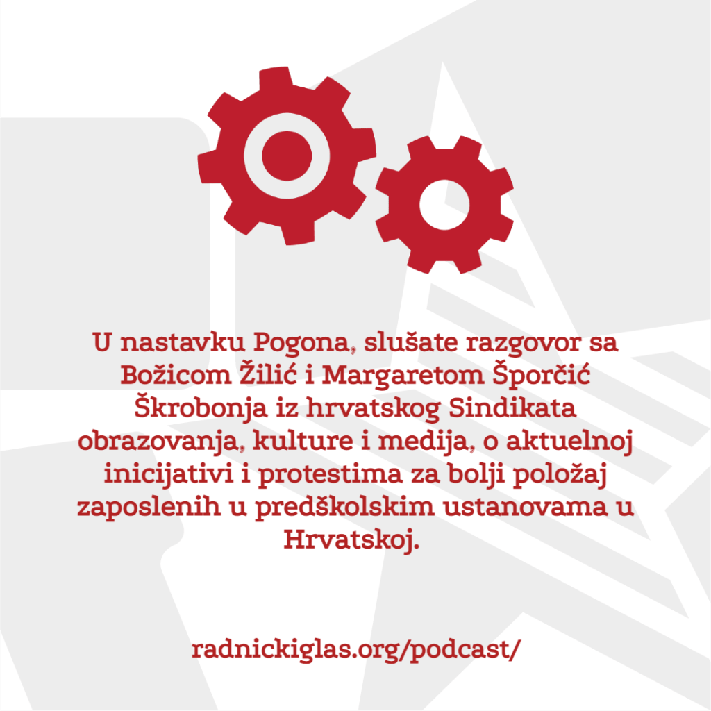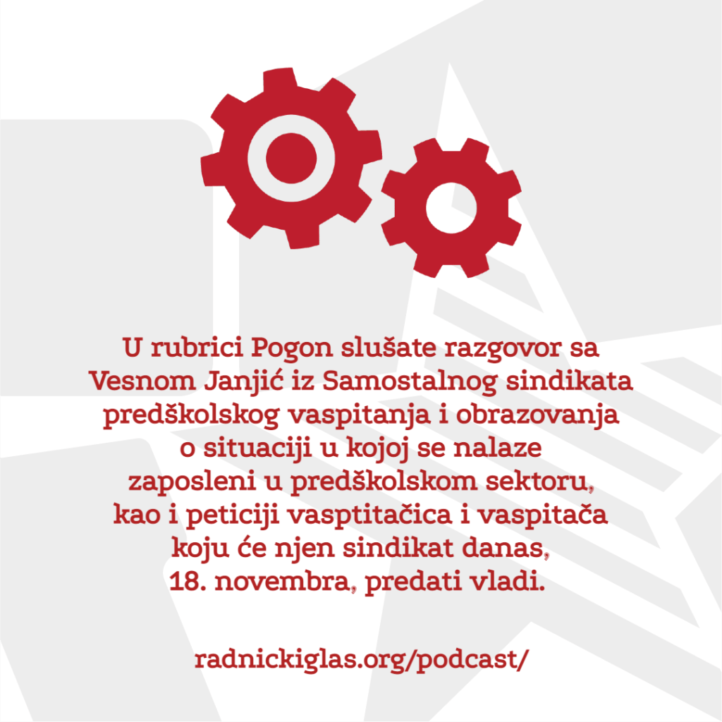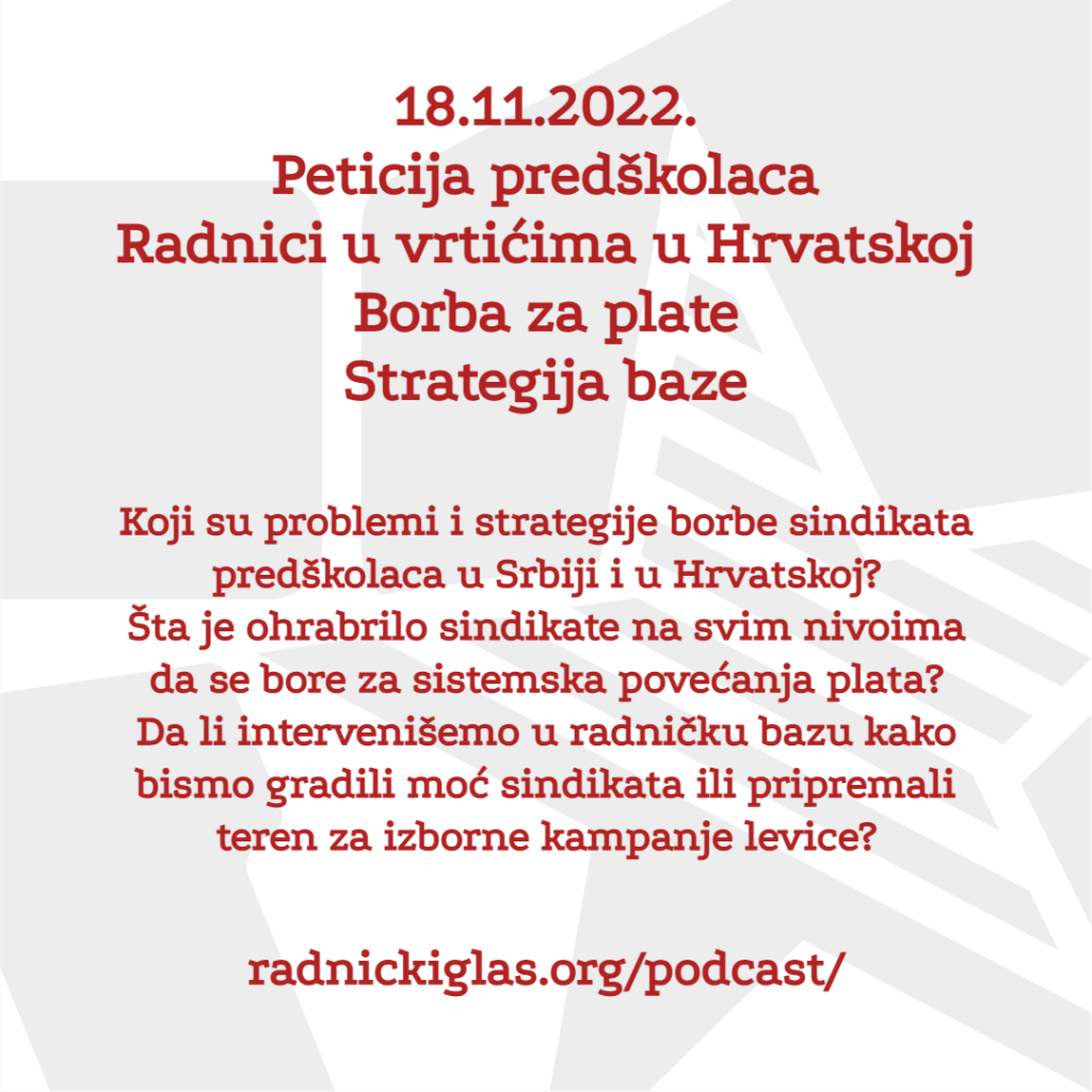 U rubrici Pogon, slušate razgovor sa Vesnom Janjić iz Samostalnog sindikata predškolskog vaspitanja i obrazovanja o situaciji u kojoj se nalaze zaposleni u predškolskom sektoru, kao i peticiji vasptitačica i vaspitača koju će njen sindikat danas, 18. novembra, predati vladi. U nastavku Pogona, slušate razgovor sa Božicom Žilić i Margaretom Šporčić Škrobonja iz hrvatskog Sindikata obrazovanja, kulture i medija, o aktuelnoj inicijativi i protestima za bolji položaj zaposlenih u predškolskim ustanovama u Hrvatskoj. Na Forumu, slušate delove diskusije Radničkog glasa o borbi za povećanje plata i pravedniju raspodelu bogatstva u doba krize, oko koje se radnici organizuju kako u Srbiji tako i u svetu. Konačno, u rubrici Čitaonica, govorimo o pamfletu Strategija baze Kima Mudija.