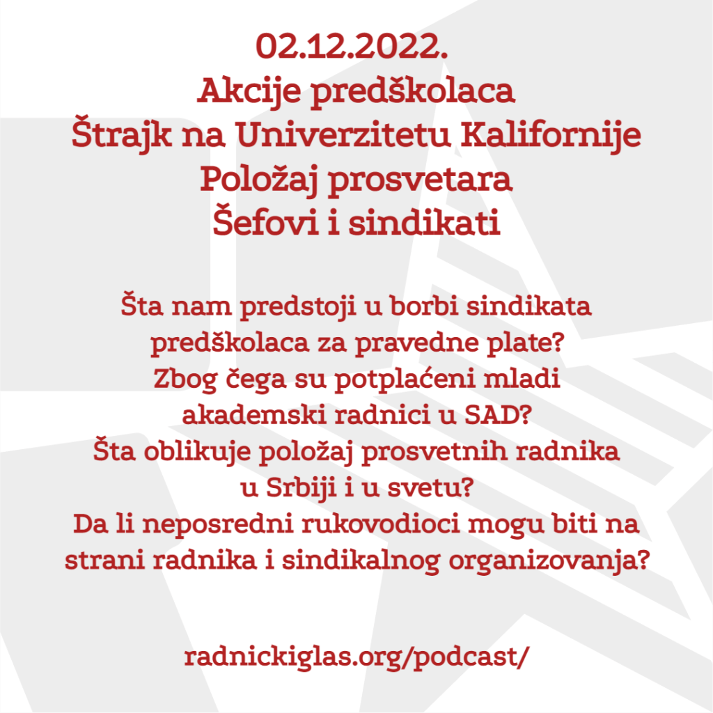 U rubrici Pogon, slušate razgovor sa Bosiljkom Jovanović iz Samostalnog sindikata predškolskog vaspitanja i obrazovanja, koji je prošle nedelje Vladi predao peticiju za reviziju uredbe, odnosno koeficijenata za plate, sa više od 30 hiljada potpisa. U nastavku Pogona, emitujemo razgovor sa Hanom Šif, jednom od 48 hiljada radnica i radnika Univerziteta Kalifornije koji već skoro tri nedelje štrajkuju za bolje plate. Na Forumu, slušate izlaganje Stefana Gužvice na tribini o položaju prosvetnih radnika u organizaciji Unije sindikata prosvetnih radnika Gornjeg Milanovca. Konačno, u nastavku Foruma, emitujemo izvod iz diskusije Radničkog glasa o odnosu menadžera i sindikalnog organizovanja.
