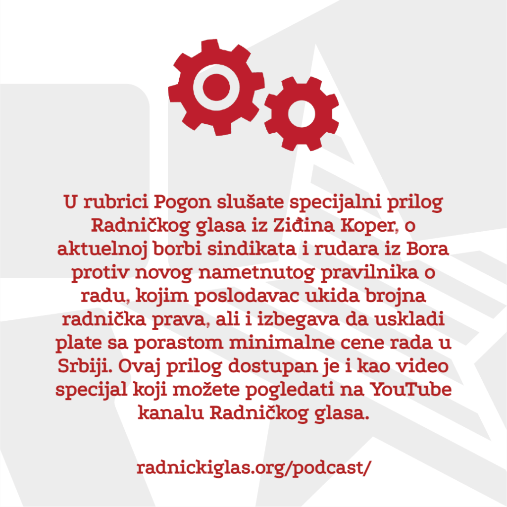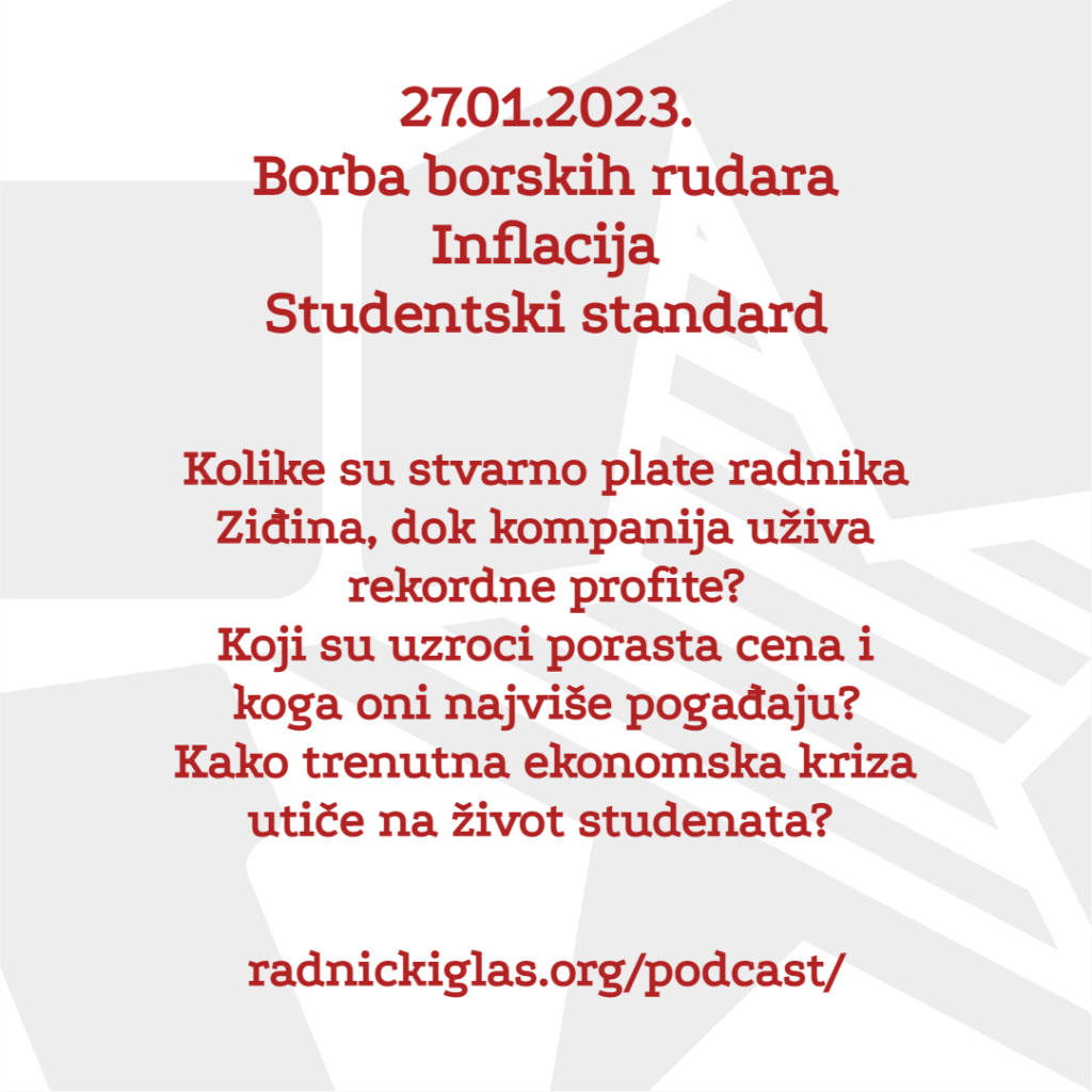 U rubrici Pogon slušate specijalni prilog Radničkog glasa iz Ziđina Koper, o aktuelnoj borbi sindikata i rudara iz Bora protiv novog nametnutog pravilnika o radu, kojim poslodavac ukida brojna radnička prava, ali i izbegava da uskladi plate sa porastom minimalne cene rada u Srbiji. Ovaj prilog dostupan je i kao video specijal koji možete pogledati na YouTube kanalu Radničkog glasa. Na Forumu razgovaramo sa sociologom Tonijem Prugom, o inflaciji i šta ona znači za ljude koji žive od svog rada. U nastavku Foruma emitujemo deo diskusije Radničkog glasa o pogoršanju materijalnog položaja studenata u kontekstu aktuelne krize.