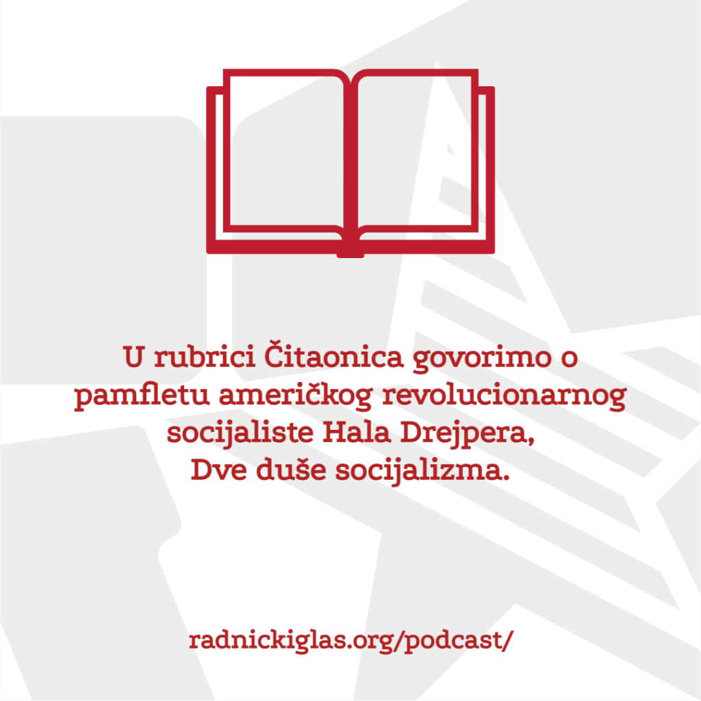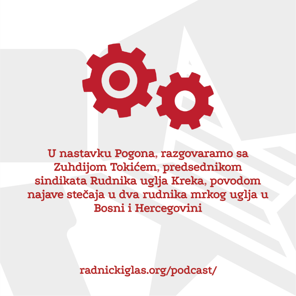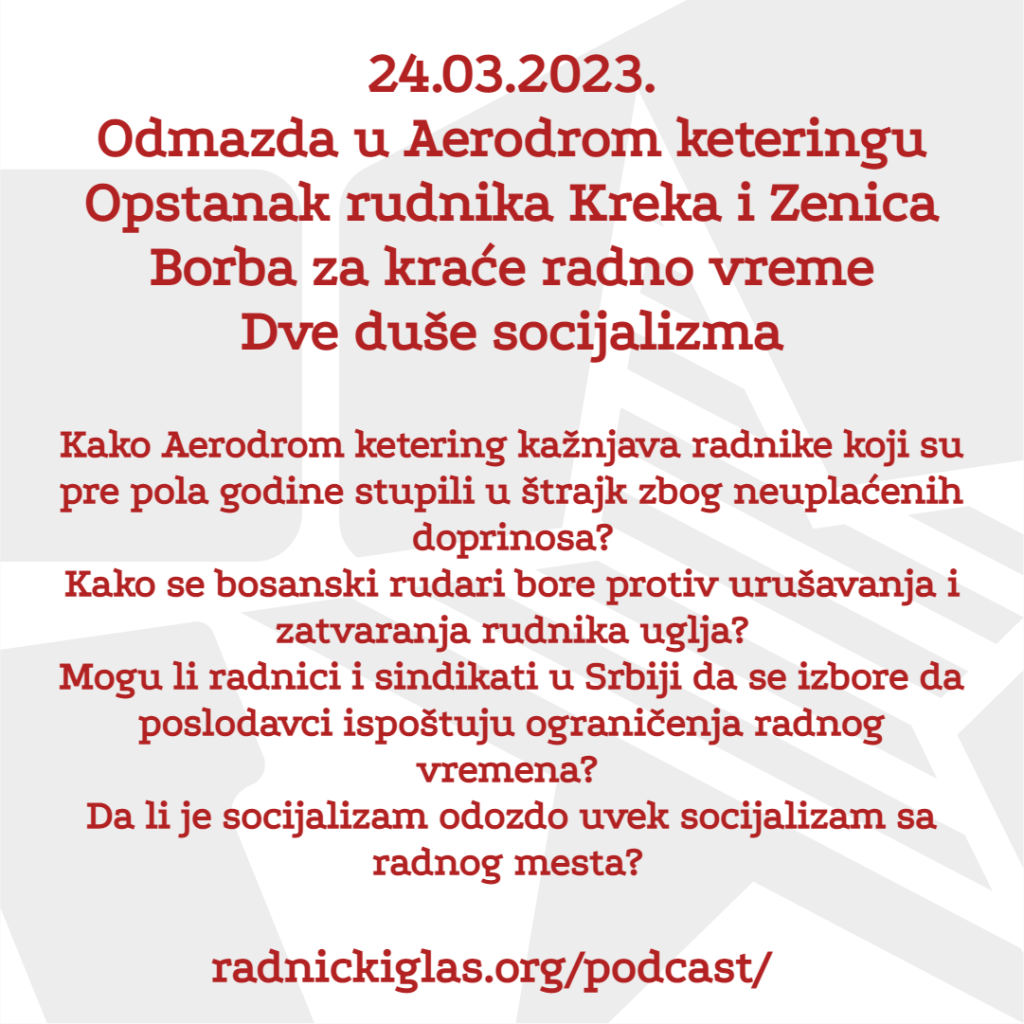 U rubrici Pogon slušate razgovor sa Draganom Kabićem, predsednikom sindikalne organizacije Aerodrom ketering, povodom nedavnog otpuštanja četrdeset radnika beogradskog aerodroma. U nastavku Pogona, razgovaramo sa Zuhdijom Tokićem, predsednikom sindikata Rudnika uglja Kreka, povodom najave stečaja u dva rudnika mrkog uglja u Bosni i Hercegovini. Na Forumu emitujemo deo diskusije Radničkog glasa o borbi za ograničenje radnog vremena. U rubrici Čitaonica govorimo o pamfletu američkog revolucionarnog socijaliste Hala Drejpera, Dve duše socijalizma.