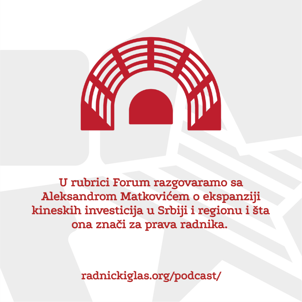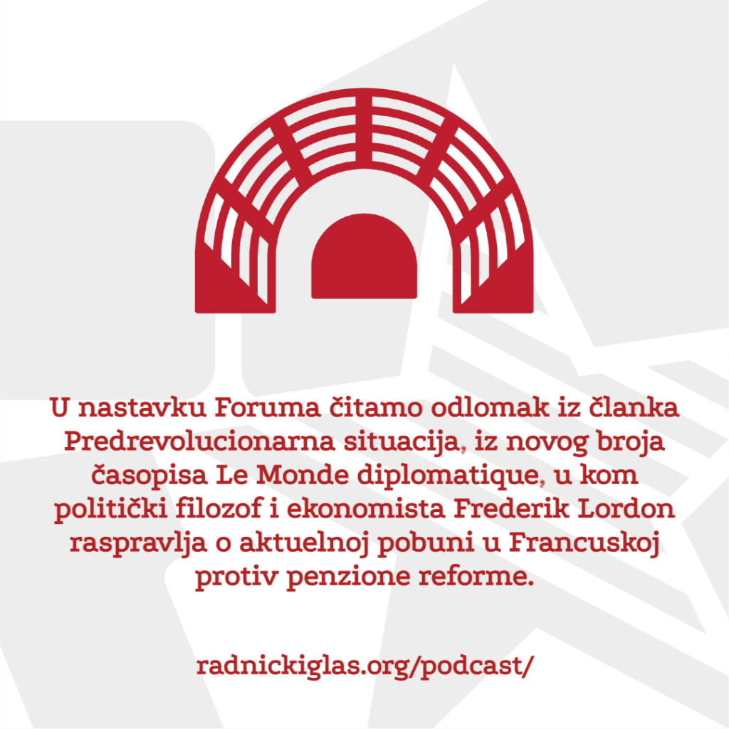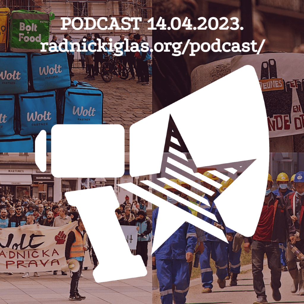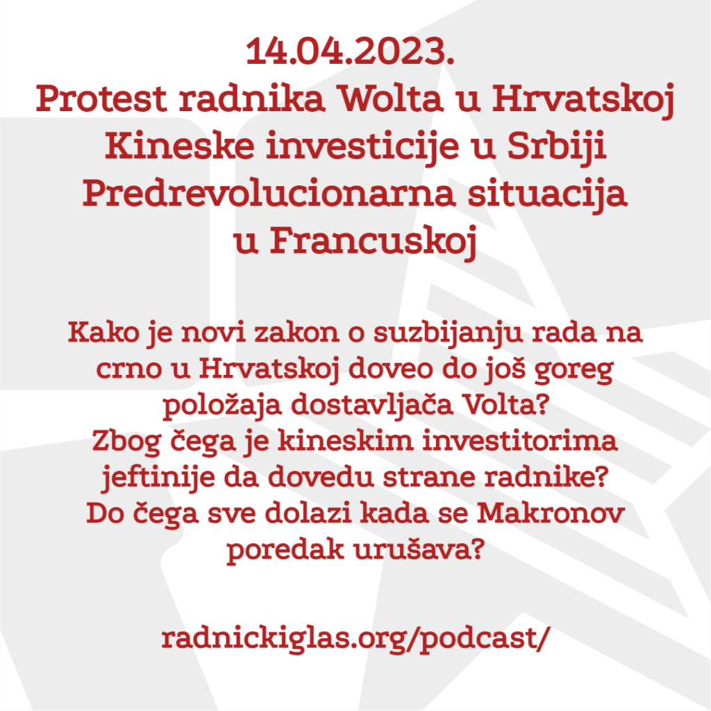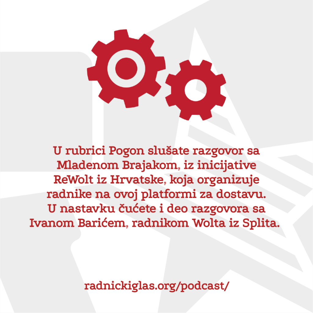 U rubrici Pogon slušate razgovor sa Mladenom Brajakom, iz inicijative ReWolt iz Hrvatske, koja organizuje radnike na ovoj platformi za dostavu. U nastavku čućete i deo razgovora sa Ivanom Barićem, radnikom Wolta iz Splita. U rubrici Forum razgovaramo sa Aleksandrom Matkovićem o ekspanziji kineskih investicija u Srbiji i regionu i šta ona znači za prava radnika. U nastavku Foruma čitamo odlomak iz članka Predrevolucionarna situacija, iz novog broja časopisa Le Monde diplomatique, u kom politički filozof i ekonomista Frederik Lordon raspravlja o aktuelnoj pobuni u Francuskoj protiv penzione reforme.