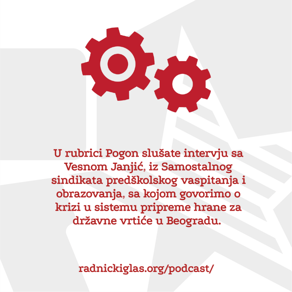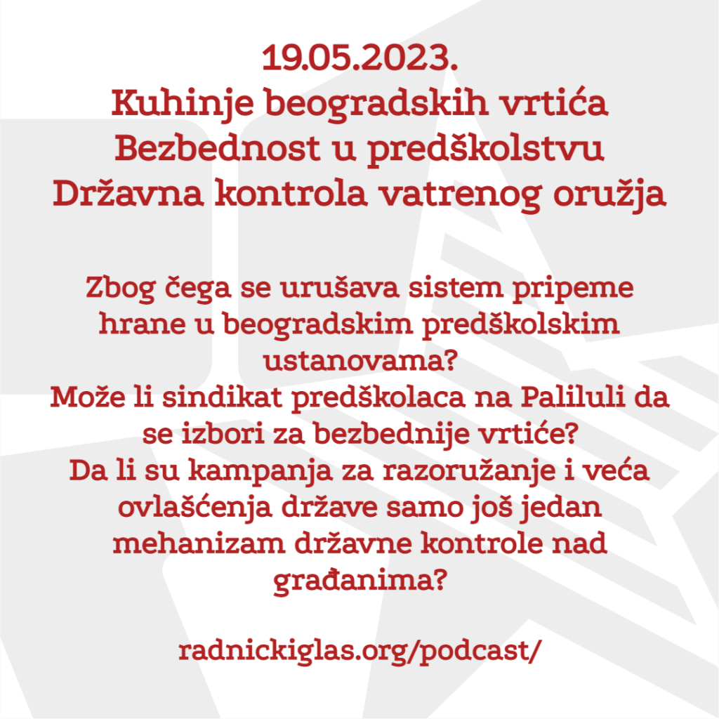 U rubrici Pogon slušate intervju sa Vesnom Janjić, iz Samostalnog sindikata predškolskog vaspitanja i obrazovanja, sa kojom govorimo o krizi u sistemu pripreme hrane za državne vrtiće u Beogradu. U nastavku Pogona, govorimo sa Mirjanom Cvijović iz istog sindikata, o inicijativama i zahtevima sindikata na Paliluli u cilju veće bezbednosti i kvaliteta rada. U rubrici Forum slušate deo diskusije Radničkog glasa o državnoj kontroli vatrenog oružja i aktuelnoj kampanji za razoružanje.