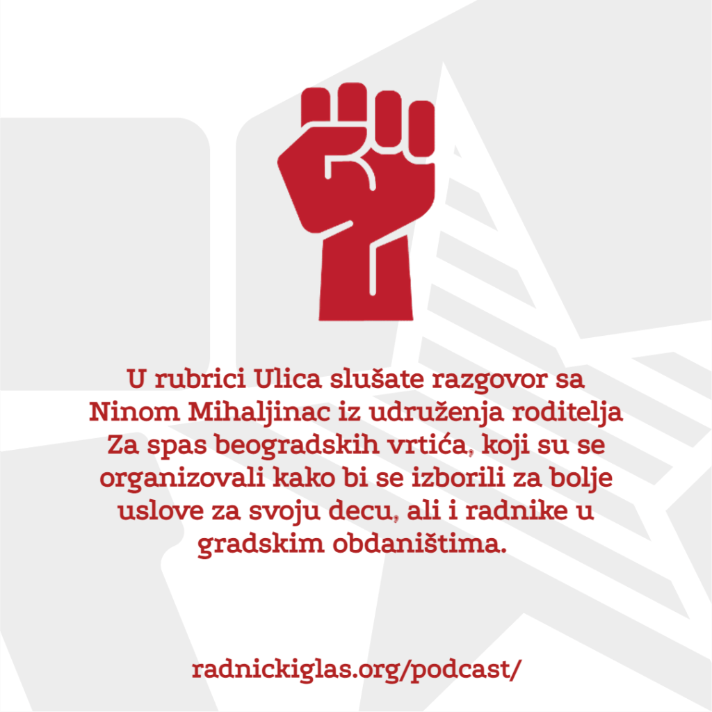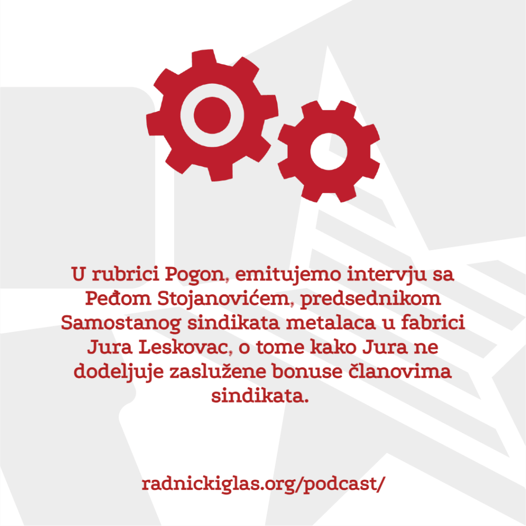 U rubrici Pogon, emitujemo intervju sa Peđom Stojanovićem, predsednikom Samostalnog sindikata metalaca u fabrici Jura Leskovac, o tome kako Jura ne dodeljuje zaslužene bonuse članovima sindikata. U rubrici Ulica slušate razgovor sa Ninom Mihaljinac iz udruženja roditelja Za spas beogradskih vrtića, koji su se organizovali kako bi se izborili za bolje uslove za svoju decu, ali i radnike u gradskim obdaništima. U rubrici Forum slušate deo diskusije Radničkog glasa o uličnim protestima kao vidu političke borbe.