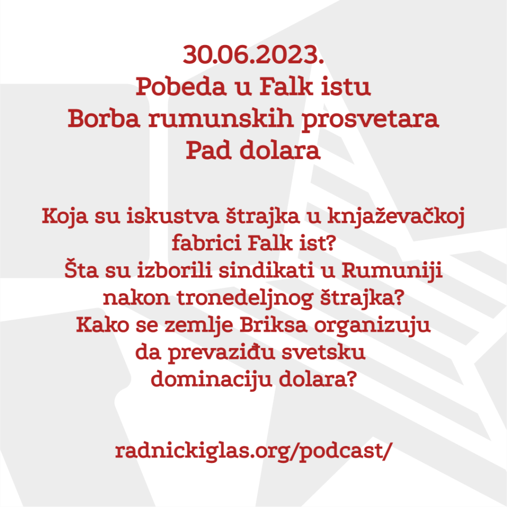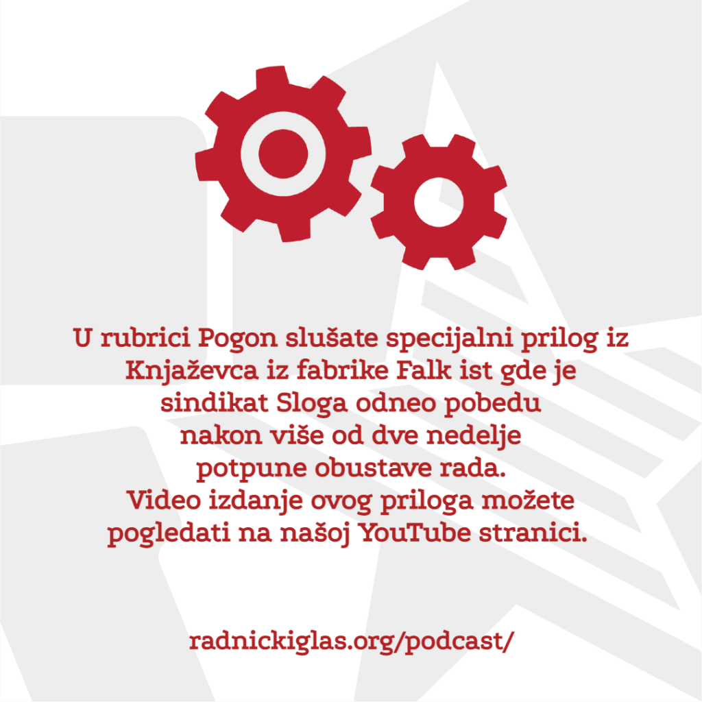 U rubrici Pogon slušate specijalni prilog iz Knjaževca iz fabrike Falk ist gde je sindikat Sloga odneo pobedu nakon više od dve nedelje potpune obustave rada. Video izdanje ovog priloga možete pogledati na našoj YouTube stranici. U nastavku Pogona, o borbi prosvetnih radnika u Rumuniji razgovarali smo sa Kristijanom Karavanom. U rubrici Forum slušate deo diskusije Radničkog glasa o zalasku dolara kao svetske valute.