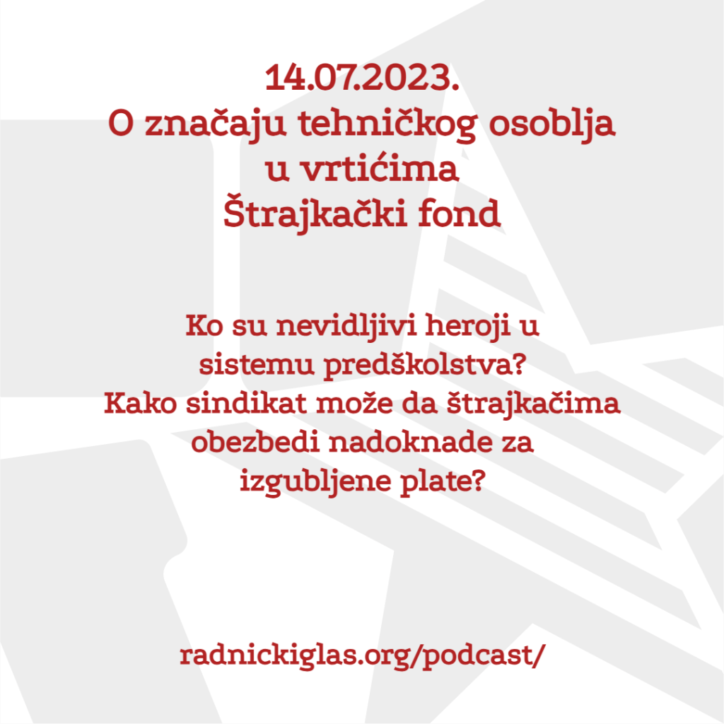 U rubrici Pogon slušate specijal Radničkog glasa i Sindikata predškolskog vaspitanja i obrazovanja Srbije, o položaju tehničkog osoblja u vrtićima. Video izdanje ovog specijala možete pogledati na našoj YouTube stranici. U rubrici Forum slušate deo diskusije Radničkog glasa o ulozi štrajkačkih fondova u sindikalnom organizovanju.