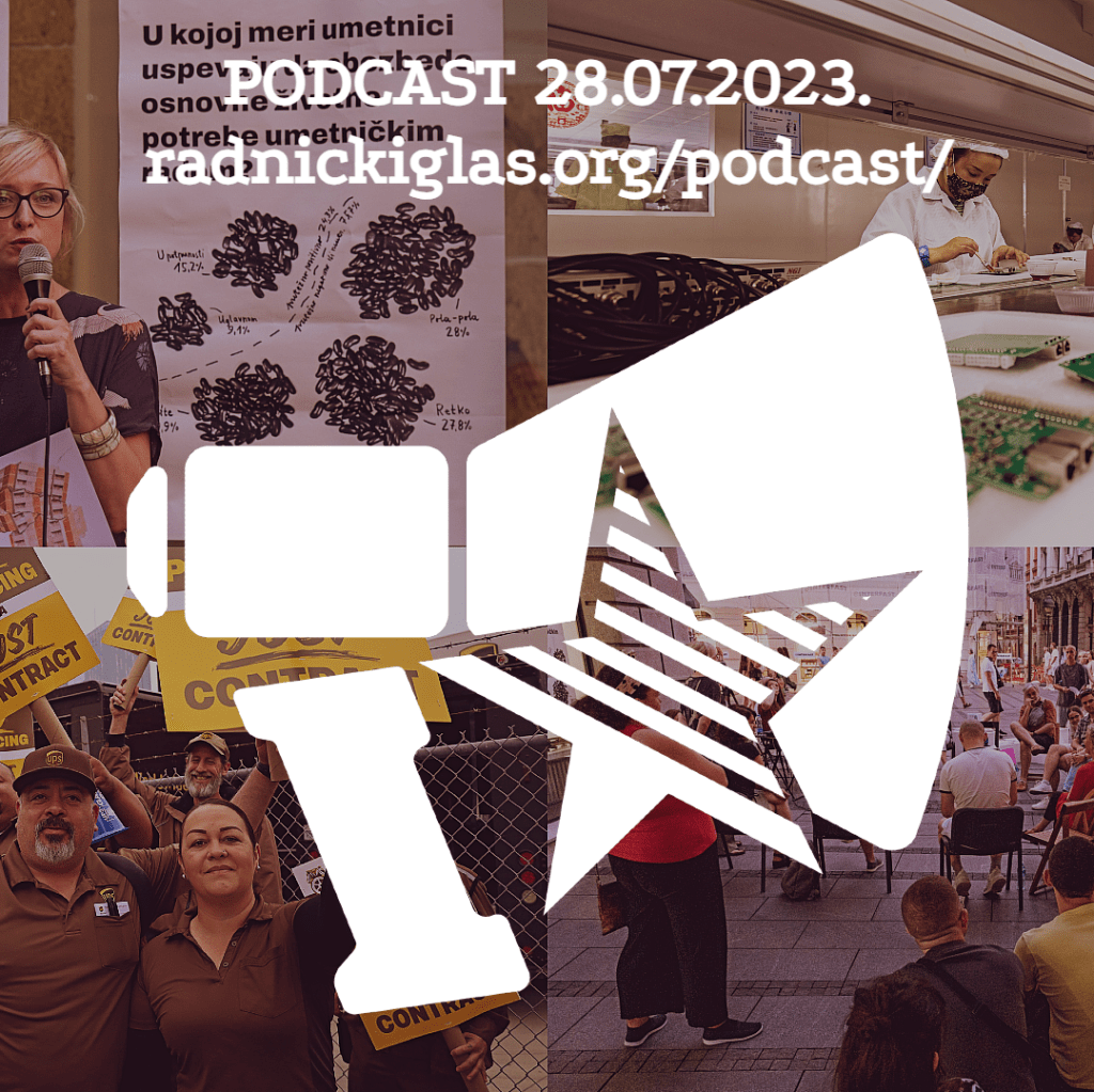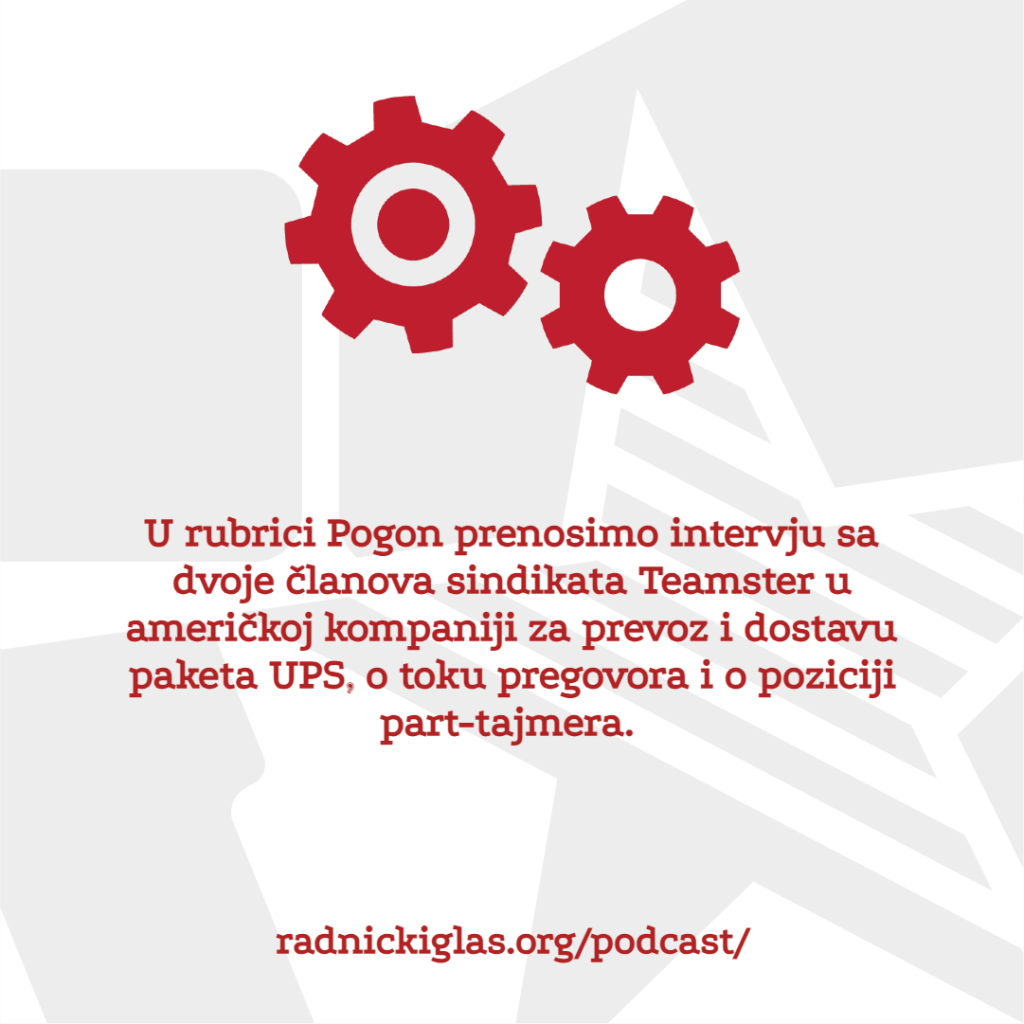 U rubrici Pogon prenosimo intervju sa dvoje članova sindikata Teamster u američkoj kompaniji za prevoz i dostavu paketa UPS, o toku pregovora i o poziciji part-tajmera. U rubrici Ulica razgovarali smo sa Vidom Knežević ispred asocijacije Nezavisna kulturna scena Srbije o materijalnom položaju i radnim pravima umetnika u Srbiji. U rubrici Forum slušate deo diskusije Radničkog glasa o globalnoj krizi u proizvodnji i snabdevanju mikročipovima.