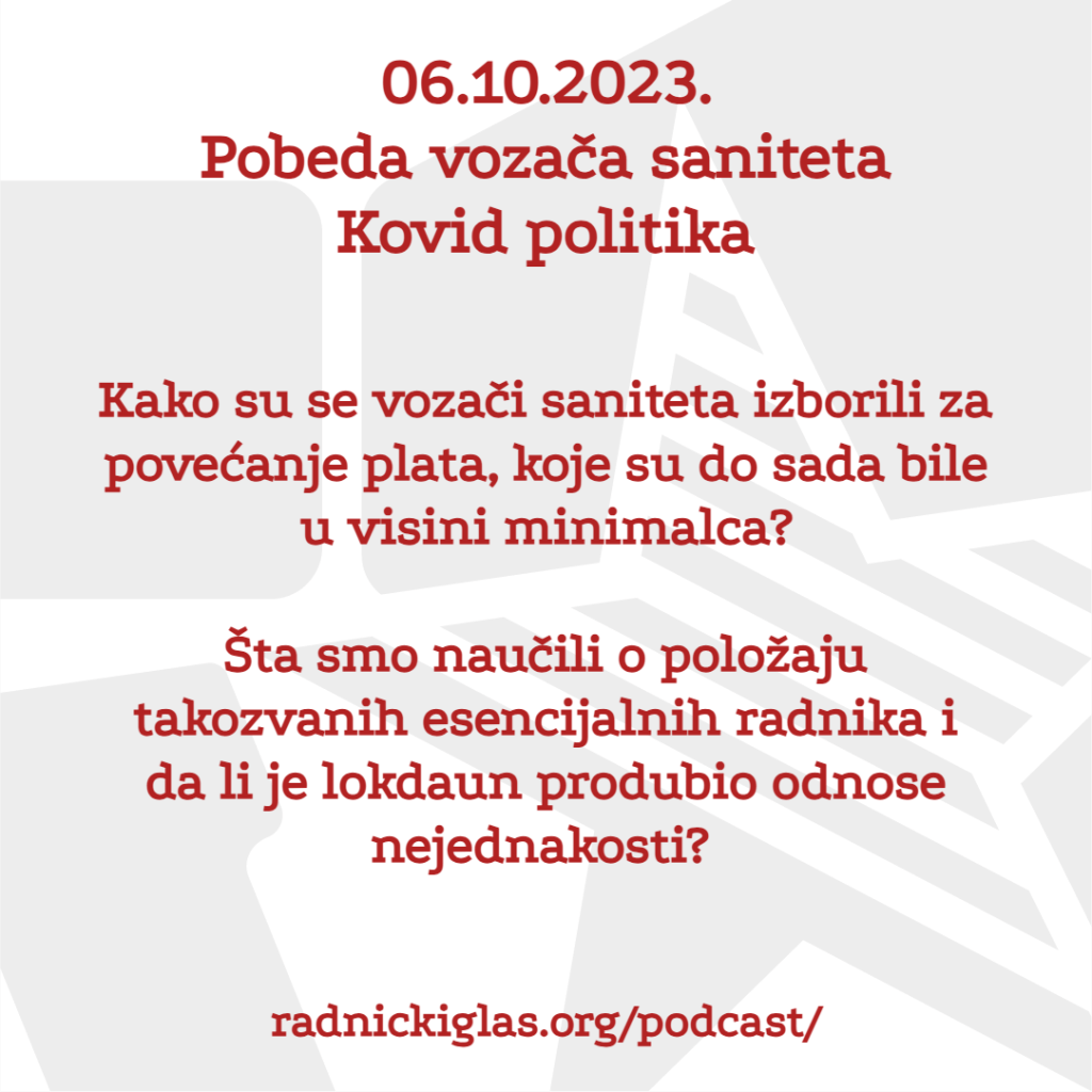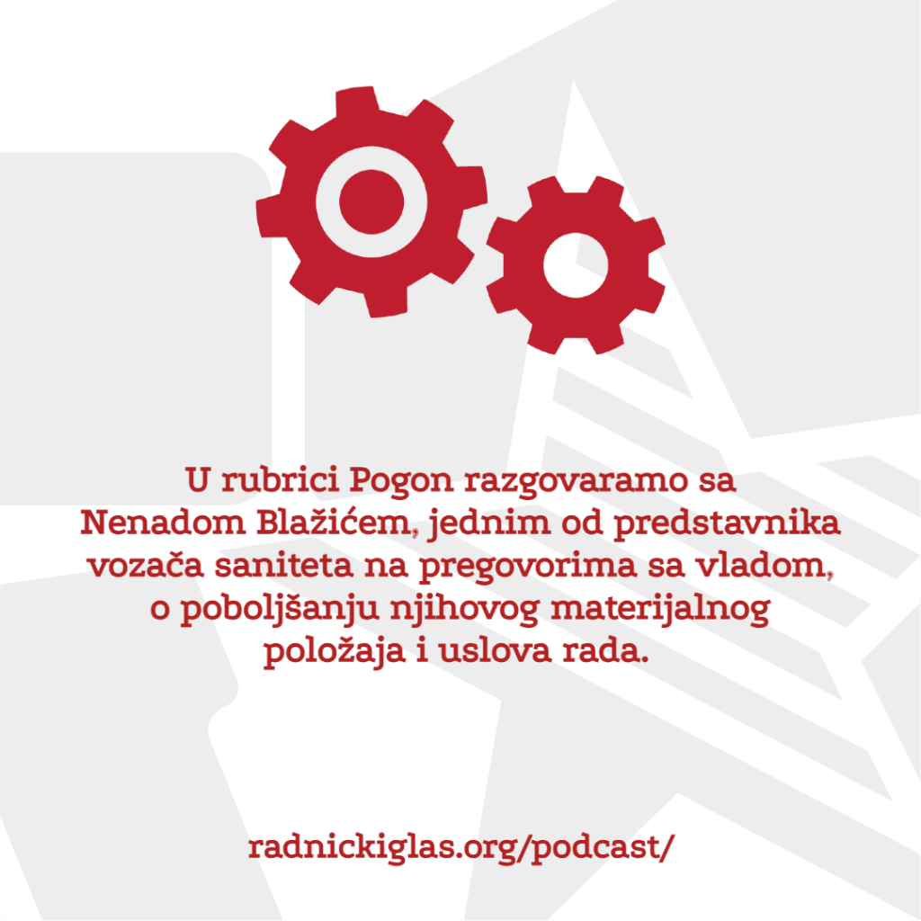 U rubrici Pogon, razgovaramo sa Nenadom Blažićem, jednim od predstavnika vozača saniteta na pregovorima sa vladom, o poboljšanju njihovog materijalnog položaja i uslova rada. U rubrici Forum slušate deo diskusije Radničkog glasa o kovid politikama.