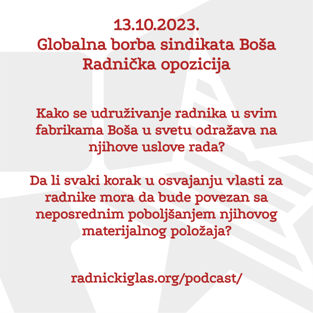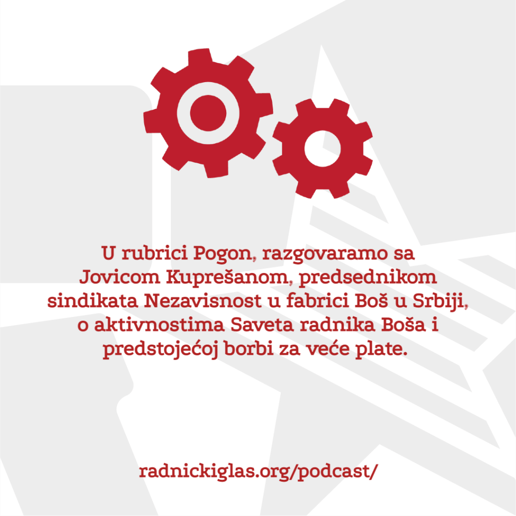 U rubrici Pogon, razgovaramo sa Jovicom Kuprešanom, predsednikom sindikata Nezavisnost u fabrici Boš u Srbiji, o aktivnostima Saveta radnika Boša i predstojećoj borbi za veće plate. U rubrici Čitaonica govorimo o pamfletu Radnička opozicija Aleksandre Kolontaj.
