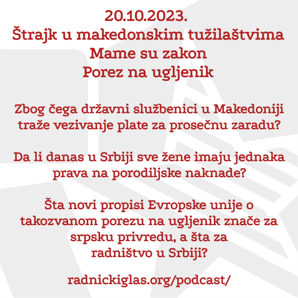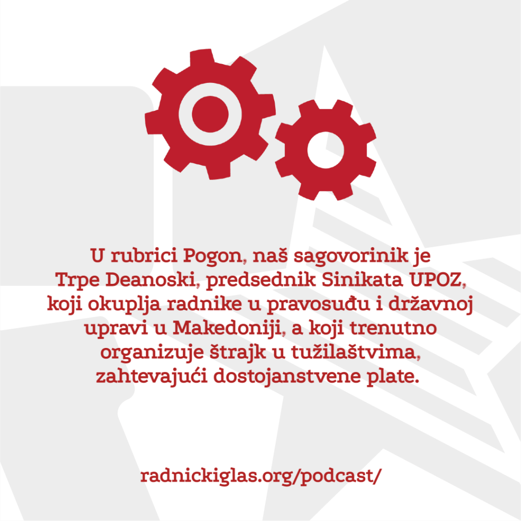 U rubrici Pogon, naš sagovorinik je Trpe Deanoski, predsednik Sinikata UPOZ, koji okuplja radnike u pravosuđu i državnoj upravi u Makedoniji, a koji trenutno organizuje štrajk u tužilaštvima, zahtevajući dostojanstvene plate. U rubrici Ulica razgovaramo sa Tatjanom Macurom, ispred inicijative Mame su zakon, o njihovoj borbi za bolji položaj trudnica i porodilja. U rubrici Forum slušate deo diskusije Radničkog glasa o porezu na ugljenik.