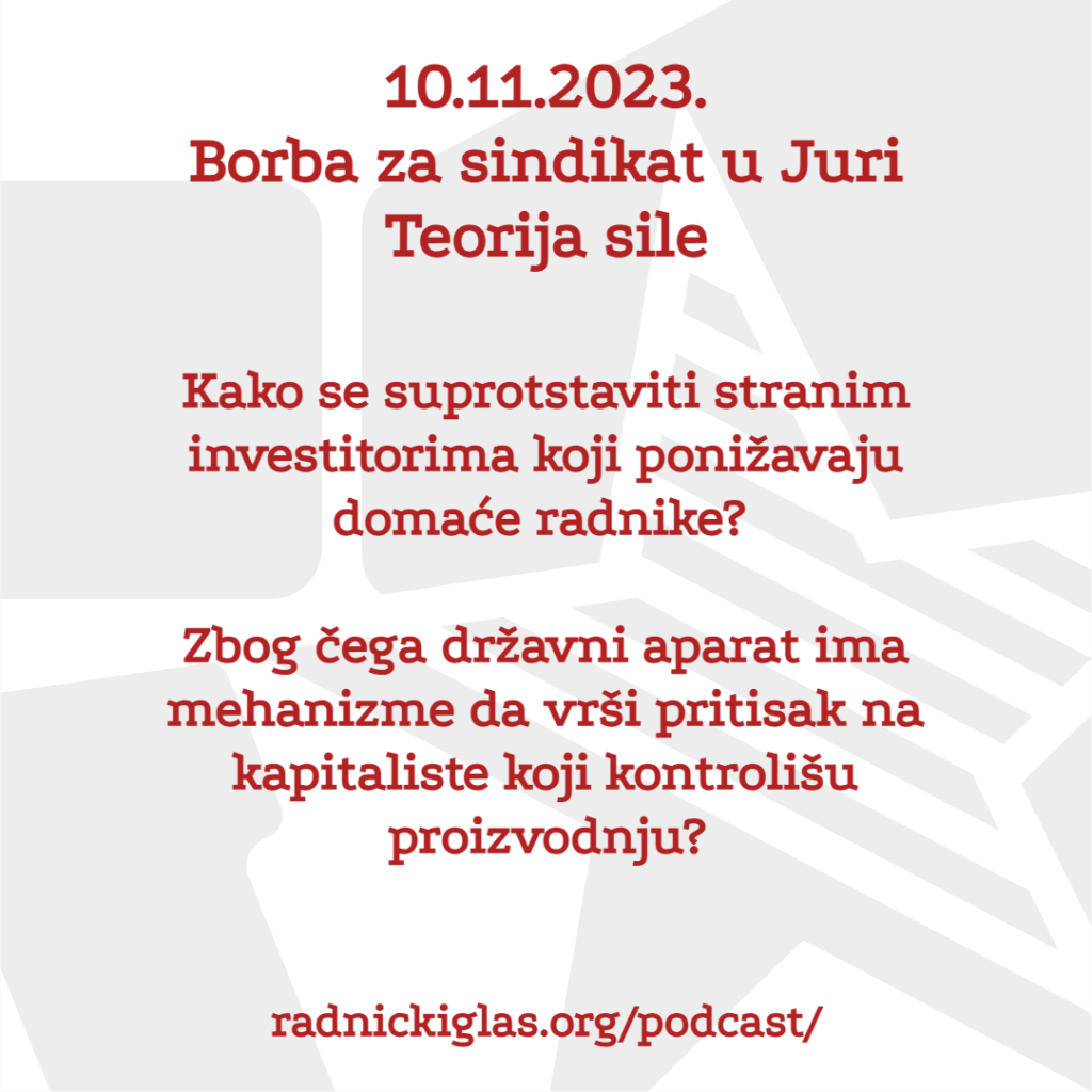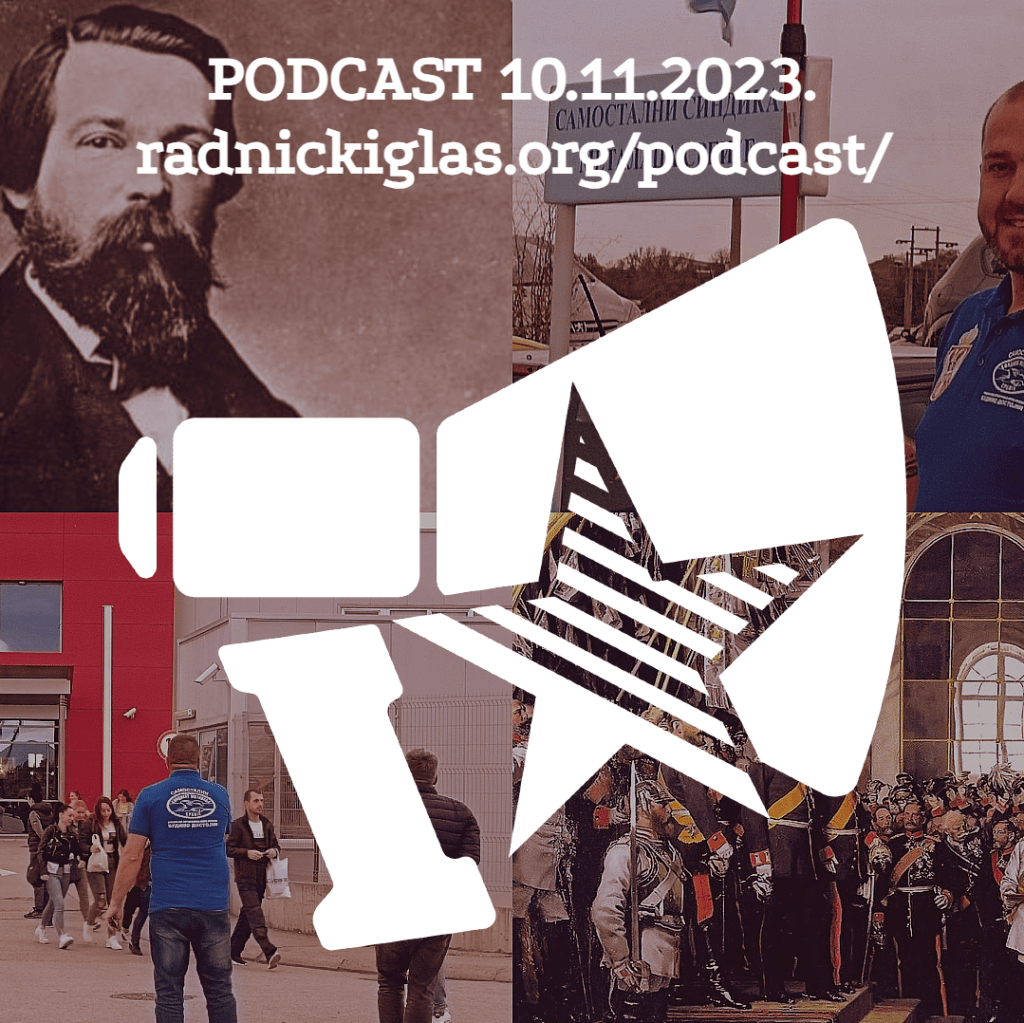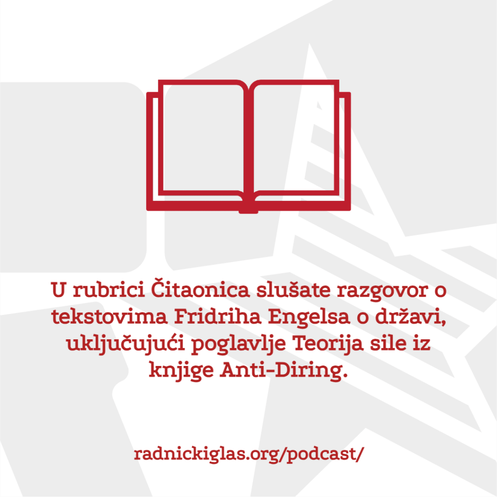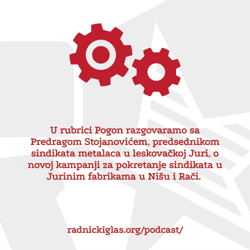 U rubrici Pogon razgovaramo sa Predragom Stojanovićem, predsednikom sindikata metalaca u leskovačkoj Juri, o novoj kampanji za pokretanje sindikata u Jurinim fabrikama u Nišu i Rači. U rubrici Čitaonica slušate razgovor o tekstovima Fridriha Engelsa o državi, uključujući poglavlje Teorija sile iz knjige Anti-Diring.