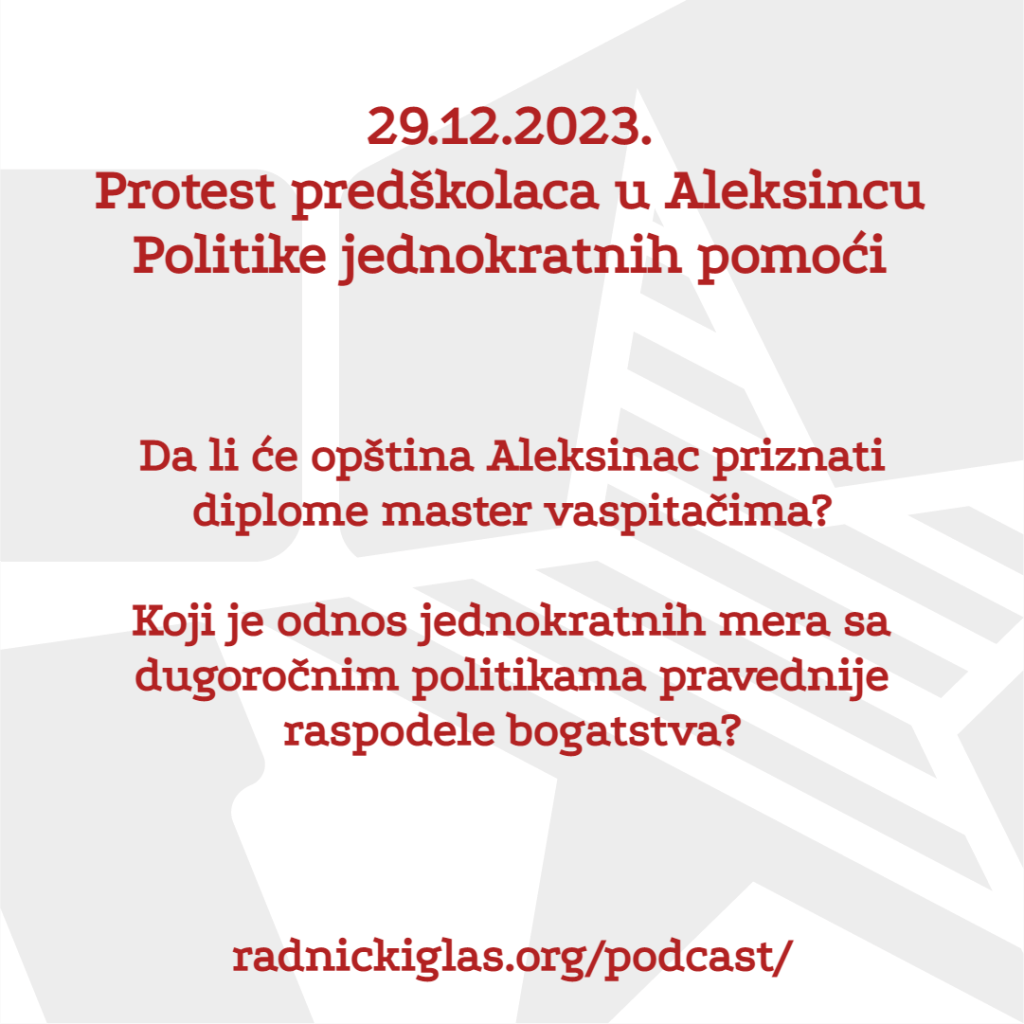 U rubrici Pogon slušate snimak protesta Samostalnog sindikata predškolskog vaspitanja i obrazovanja u Aleksincu, za priznavanje koeficijenata doškolovanom kadru. U rubrici Forum slušate deo diskusije Radničkog glasa o politikama jednokratnih pomoći.