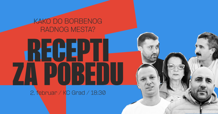 U okviru godišnjeg seminara Radničkog glasa, u petak 2. februara održaćemo i javnu tribinu. Na njoj će učestvovati Kosana Dimitrov, predsednica Samostalnog sindikata predškolskog vaspitanja i obrazovanja u Kraljevu, Uroš Savić, predsednik sindikata Sloga u Falk istu iz Knjaževca, Peđa Stojanović, predsednik Samostalnog sindikata metalaca u Juri iz Leskovca, kao i Srđan Atanasovski iz Radničkog glasa. Diskusiju će moderirati Matija Medenica, takođe iz Radničkog glasa. Kosana, Uroš i Peđa podeliće svoja iskustva iz borbi tokom protekle godine, a razgovaraćemo i o izazovima organizovanja u autoindustriji i predškolstvu i o doprinosima našeg radioničarskog programa ostvarivanju ciljeva njihovih sindikalnih organizacija.